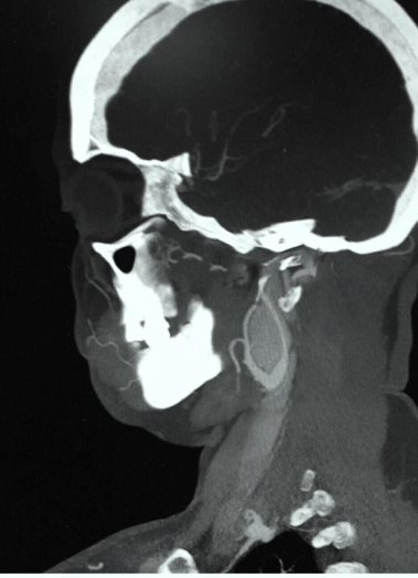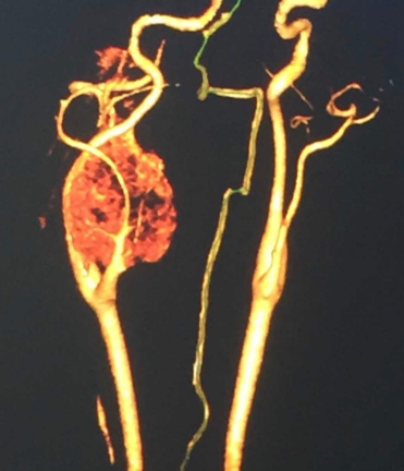 The figure 2 shows the MRA that helped us explain the vascular nature of the tumor and extent of the growing structure. These images helped in the final diagnosis of carotid body paraganglioma that was relatable with high blood pressure and the probable site of the presence of glomus cells, the primary site of this tumor.