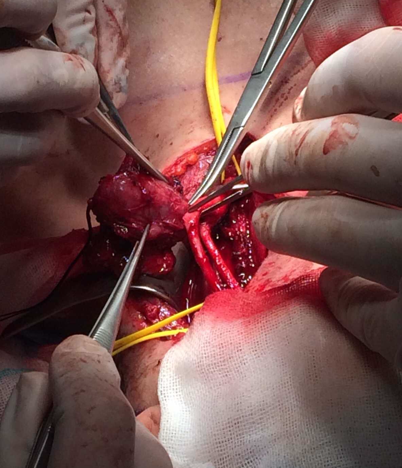 Considering patient’s incapacitated state, the consent was taken from the patient’s wife for a surgical intervention. A vascular surgeon intervened and the patient was held in a supine extended neck position. The surgeon retracted sternocleidomastoid laterally and omohyoid medially. The bifurcation of the common carotid was visualized with a hard mass at the site. Vascular looping was done for the vessels and the tumor was located and excised. The figure 3 shows the technique of approaching this tumor mass and removing it by careful manipulation around this mass. The extracted sample was sent to the pathology for histological analysis, that later confirmed it as a paraganglioma or more popularly known as carotid body tumor. The patient was kept under observation and the caregivers were advised to have a follow-up in a month.