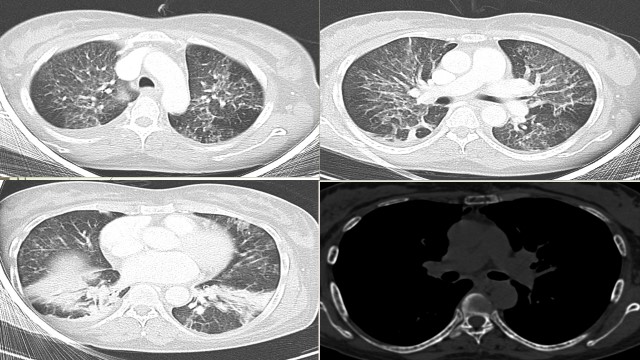 Serum Beta 2 macroglobulin was 3143 mg/dl. Thus, the diagnosis of multiple myeloma with myeloma cells infiltrates in lung showing ILD pattern was made.