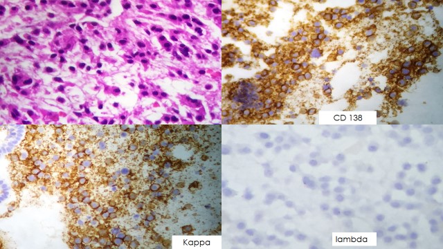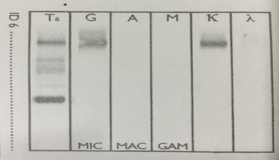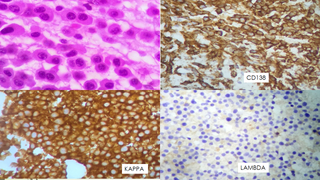 Serum Immunofixation electrophoresis showed IgG Kappa chain dominance (148.20 mg/L) and increased kappa/lambda ratio (19.32) [figure 5].