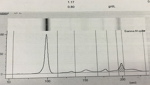 The patient responded significantly well to the treatment with improvement. After 4 cycles of chemotherapy, Plasma protein electrophoresis showed a decrease in M spike (0.80 g/dl) [figure 6].