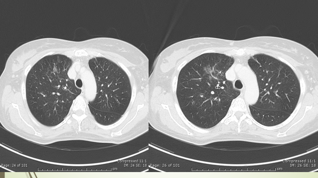 Multiple myeloma (MM) is a neoplastic plasma-cell disease known for its infiltration of malignant plasma cells in the bone marrow accompanied by multi-organ dysfunction. The median age at diagnosis is approximately 70 years [1]. Less than 2% of the patients are younger than 45 years of age at diagnosis [2]. MM may present as a diffuse disease of the bone (myelomatosis), or may be as a single plasmacytoma of bone or as an extramedullary plasmacytoma (EMP). The very common thoracic involvement by MM is the bone involvement or infiltration of the lungs secondary to an infection. Although, the pulmonary parenchyma is quite a rare site of extra medullary involvement in MM patients, Interstitial lung disease (ILD) as a pulmonary manifestation of MM is even rarer. Only few proved cases have been reported in the literature so far. Therefore, we present a rarest case possible of a multiple myeloma presenting as ILD.