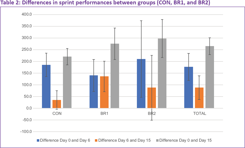 A one-way ANOVA demonstrated that although there were slight increases in the distance covered by all three groups, this was statistically insignificant (P = 0.887). Further analysis revealed the CON group increased by only an additional 35 m. However, BR1 and BR2 increased more dramatically. If the research only considered this segment of data, BR1 would have been the most suitable for performance enhancement. Results demonstrated that although all groups improved over the 15 days in sprint performance measured by distance covered, the increases were statistically insignificant (P = 0.694). A dose-related enhancement with BR was observed, with the data trending toward significance despite this small sample. The CON group increased by 220 m, while BR1 increased by 276 m and BR2 increased by 298 m over the three sprints. This translates into a 25.45% increase for BR1 and a 35.45% increase for BR2 when compared to the CON group [Figure 2].