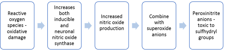 Oxidation can be fatal for the various cell components such as the proteins, carbohydrates, lipids and the genetic constitution which includes the DNA and RNA [9]. It can not only accelerate the production of the inducible nitric oxide (iNOS) but also, augments the activity of neuronal NOS (nNOS) which can further increase the production of nitric oxide (NO). NO on interaction with the superoxide anions forms a highly reactive peroxy-nitrite anion which subsequently, impairs the sulfhydryl groups of the cells. [10]. Figure 1 depicts this process.