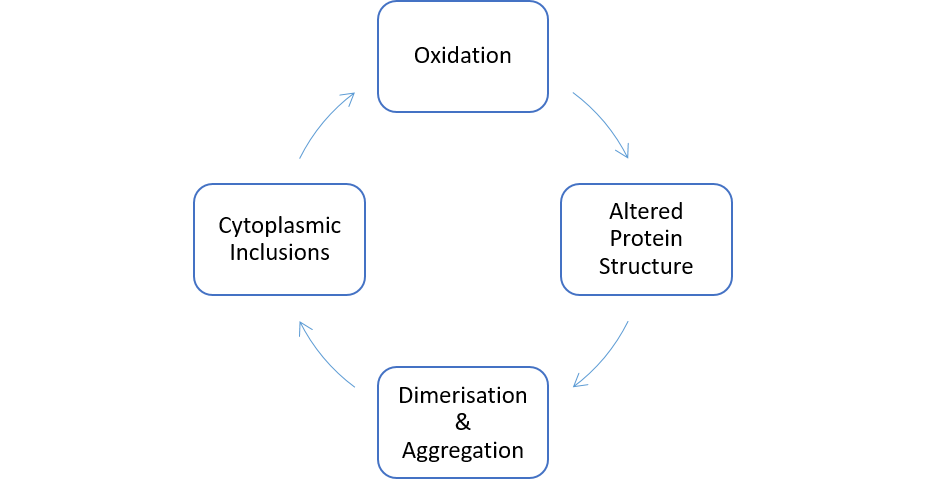 Furthermore, oxidative stress has the potential to alter the protein structure. Impaired protein structure can further augment the oxidative damage. ROS causes these proteins to be oxidized and creats a modified structure which may get dimerized and aggregated [11]. These oxidised proteins, which is both structurally and functionally abnormal, gathers as accumulates within the cytoplasm of the neurons and is seen in the form of NFT (tau aggregates) and Aß plaques [12]. Alternatively, Aß plaques can also cause increased formation of ROS which forms a vicious cycle. This pathway is depicted in figure 2.