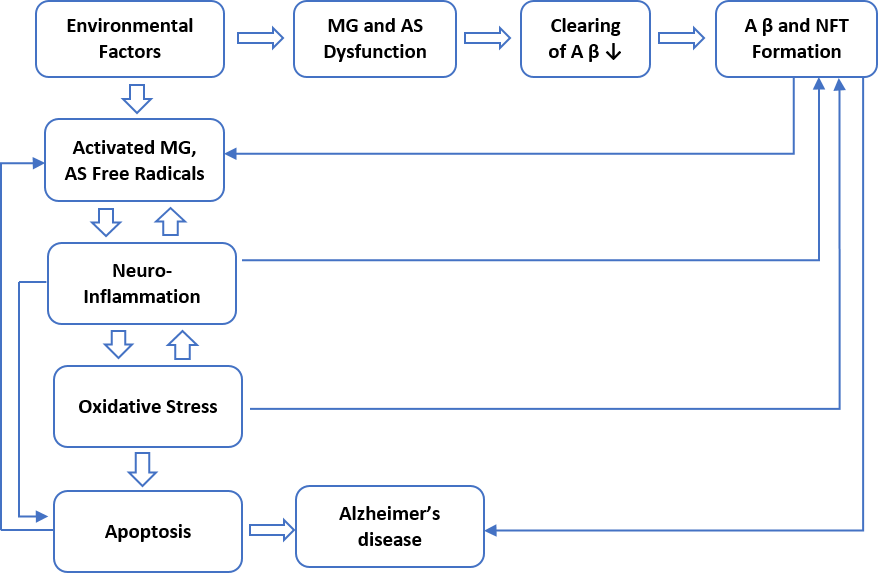 Glutathione reductase (GR) and Glutathione peroxidase (GPx) also feature in cellular defence mechanism which counteracts the oxidative stress. Interestingly, GPx augments the metabolism of hydrogen peroxide and lipid hydroperoxides [25] while GR accelerates the reaction which helps in the regeneration of Glutathione (GSH) [26]. To summarize, it is the oxidative stress coupled with the impaired cellular defense mechanism against the free radicals that is responsible for the development of AD. Figure 3 depicts AD pathogenesis.